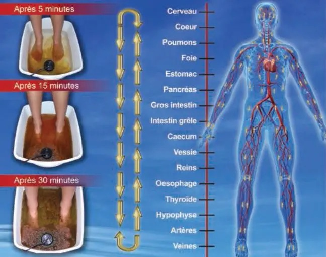 Le fonctionnement de la détoxination ionique est basé sur l’utilisation d’un générateur d’ions déposé dans une eau saline où l’on y immerge les pieds. Cela va créer une électrolyse de l’eau et à travers la polarité du courant de faible intensité, va devenir un aimant pour les acides et toxines du corps. Cela va donc permettre à nos cellules de s’alimenter en ions négatifs ou d’éliminer nos toxines.